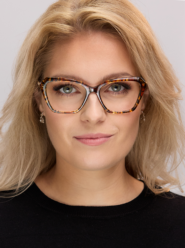 Eleganckie damskie oprawki okularowe Olinda LVII o lekko geometrycznym, kwadratowym kształcie z subtelną linią cat-eye to harmonijne połączenie nowoczesnego designu i ponadczasowej kobiecej elegancji. Front wykonany z wysokiej jakości acetatu wyróżnia się wyrazistą, wielotonową kolorystyką, która w zależności od wersji nadaje modelowi naturalnej głębi, biżuteryjnego charakteru lub klasycznej, stonowanej elegancji. Smukłe zauszniki wykonane ze stali nierdzewnej w kolorze złota posiadają subtelnie profilowany, lekko geometryczny kształt z delikatnym zwężeniem ku końcówkom. Ich elegancka, wydłużona linia oraz dopracowane detale konstrukcyjne nadają oprawom lekkości i luksusowego charakteru, a ergonomiczne wykończenie zapewnia stabilne dopasowanie i wysoki komfort noszenia przez cały dzień. Model doskonale sprawdzi się zarówno w codziennych stylizacjach, jak i w bardziej eleganckich, biznesowych czy wieczorowych zestawach. To stylowe oprawki damskie z acetatu i metalu, łączące trwałość, wygodę i modowy charakter.