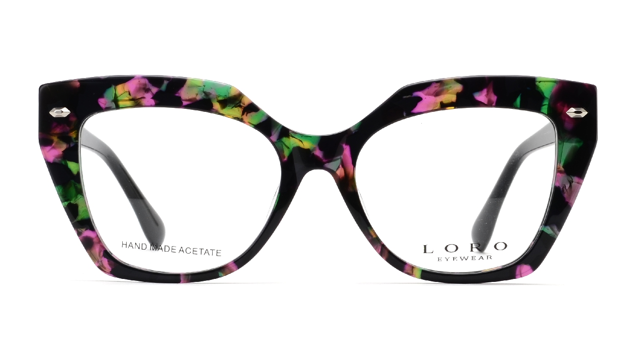 Te damskie oprawki wyróżniają się wyrazistym, kwadratowym kształtem, który dodaje charakteru i podkreśla rysy twarzy. Front wykonany jest z lekkiego i trwałego acetatu, łączącego elegancką czerń z subtelnym wzorem w odcieniach zieleni, fioletu i różu. Dzięki temu całość prezentuje się nowocześnie, ale jednocześnie kobieco i lekko artystycznie.