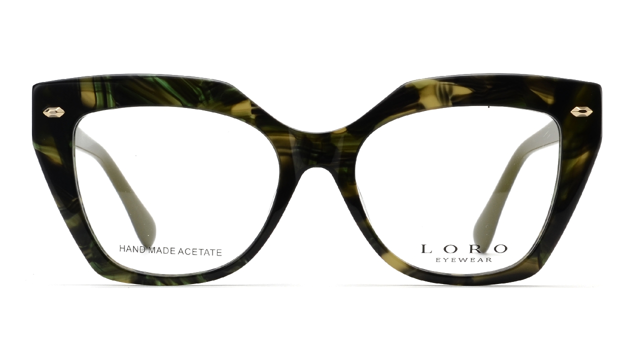 Te damskie oprawki o wyrazistym, kwadratowym kształcie zostały wykonane z lekkiego i trwałego acetatu. Front utrzymany jest w tonacji ciemnej zieleni i czerni z delikatnym, marmurkowym wzorem, który nadaje całości głębi i elegancji. Całość uzupełniają gładkie, oliwkowe zauszniki, tworząc spójny i stonowany efekt.