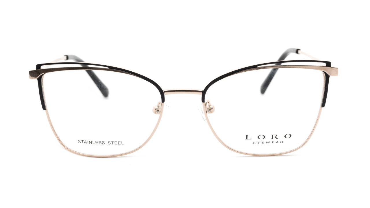 Szykowne oprawki o kocim kształcie to propozycja dla kobiet ceniących subtelną elegancję z nowoczesnym akcentem. Model wykonany z lekkiej stali nierdzewnej w odcieniu różowego złota z kontrastującym czarnym akcentem na górnej krawędzi frontu, uzupełniony został o czarne końcówki zauszników, co dodaje całości klasy i uniwersalnego charakteru. Ten ponadczasowy wariant kolorystyczny doskonale sprawdzi się w każdej stylizacji – zarówno codziennej, jak i bardziej formalnej.