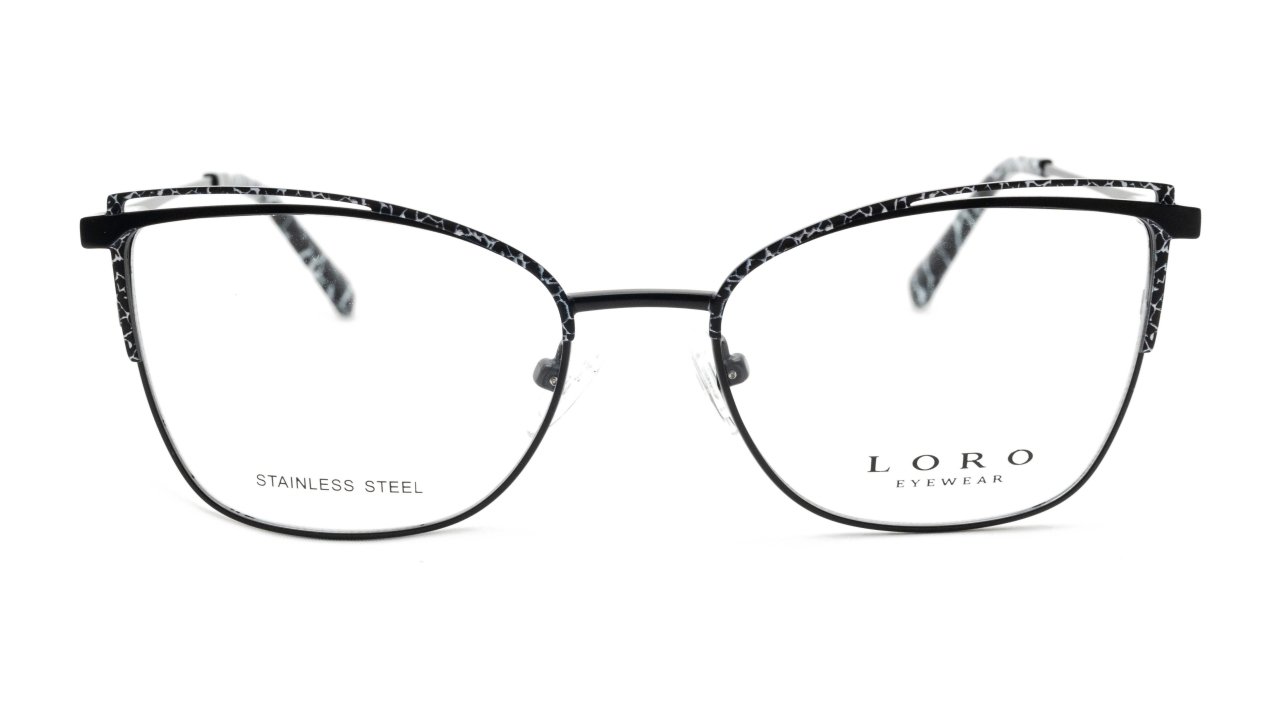 Szykowne oprawki o kocim kształcie to propozycja dla kobiet ceniących subtelną elegancję z nowoczesnym akcentem. Model wykonany z lekkiej stali nierdzewnej w odcieniu głębokiej czerni z dekoracyjnym, marmurkowym wzorem na górnej krawędzi frontu oraz na końcówkach zauszników. Kontrastowe detale nadają całości oryginalny, stylowy charakter, który doskonale podkreśli indywidualność właścicielki.