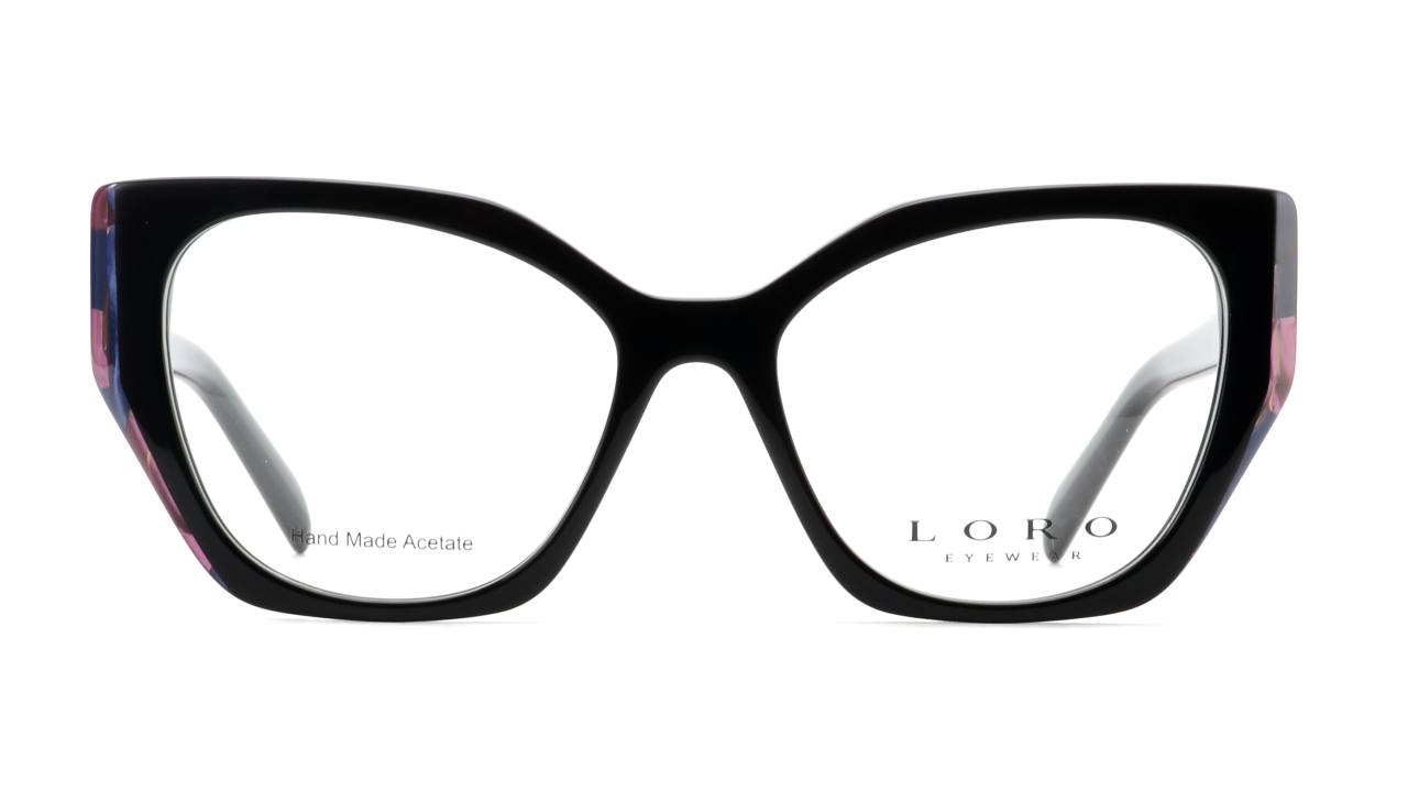 Eleganckie damskie oprawki o lekkim kocim kształcie, który dodaje twarzy wdzięku i podkreśla rysy. Klasyczna czerń frontu została przełamana delikatnym akcentem w odcieniach granatu i burgundu przy krawędzi. Wykonane z wysokiej jakości, lekkiego acetatu, zapewniają wygodę noszenia oraz trwałość na lata.