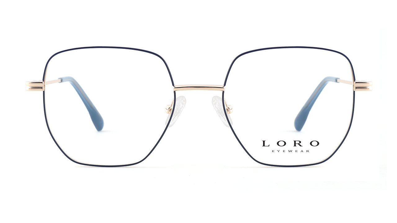 Delikatne damskie oprawki o geometrycznym, lekko kocim kształcie w odcieniu ciepłego złota z chłodno niebieskimi końcówkami zauszników. Wykonane z lekkiego, wytrzymałego metalu, łączą elegancję z nowoczesnym charakterem. Smukła linia i minimalistyczny design podkreślą rysy twarzy, dodając całości subtelnej wyrazistości.